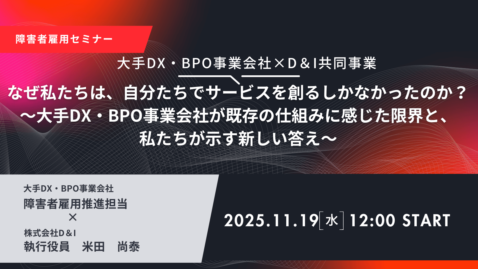本セミナーは、大手DX・BPO事業会社が、なぜD&Iと共に、自ら障害者雇用サービスを始めるという決断に至ったのか、その背景と具体的な取り組みをご紹介するものです。